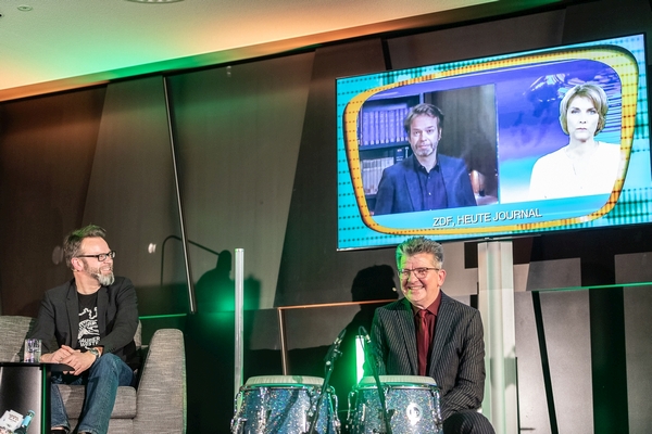 Jens Heinrich Claassen und Adam Riese scherzen über die sozialen Medien. Riese: „Weißt Du, wo Menschen meines Alters angemeldet sind? Bei Doctolib!“