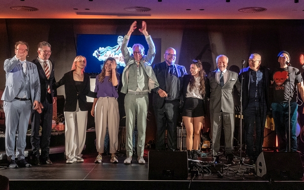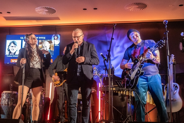 Finale im Engelsaal. Die Westfälischen Nachrichten schroben: „Auch der Musiker Beckmann [rechts im Bild], der in den Achtzigern mit der Band Rainbirds Furore machte, lieferte tolle Songeinlagen; sehr gut unterstützt von der Sängerin Linda Suárez [links] und Markus Paßlicks Original Pumpernickeln.“