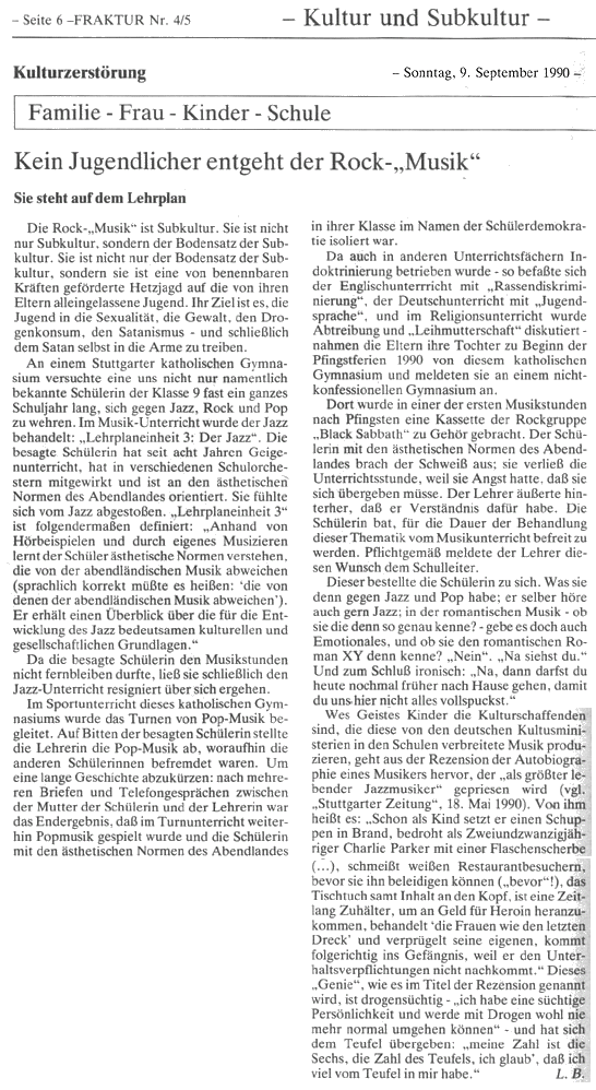 Im Inneren des Heftes klärt uns fraktuR über die Gefahren der Rockmusik auf. Das Obskuritäten-Kabinett dankt der Redaktion von fraktuR hierfür ganz besonders.