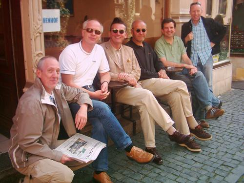 ![]() Götz Alsmann Band. 2005. Im Juli 2005 während der Sommertournee in Bacharach. Von links nach rechts: Helmut Phillips (Tontechniker), Altfrid M. Sicking (Vibraphon), Götz Alsmann (Gesang, Ukulele, Klavier), Mike Müller (Bass), Markus Paßlick (Percussion) und Rudi Marhold (Schlagzeug). Ludwig Götz spielte bis 2004 die Posaune. |