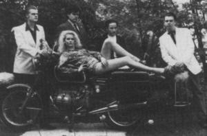 liegt auf einem Motorrad. 1992. Ihre Band von