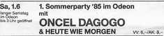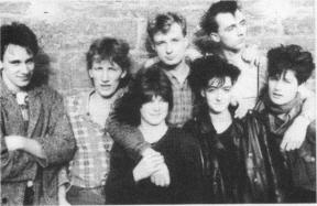 ![]() Oncel Dagogo. 1985. Von links nach rechts: Christoph Becker (Keyboards), Jofri Bondzio (Bass), Kirsten Becker (Schlagzeug), Ekki King (Gesang, Gitarre, Posaune), Roswitha Latour (Gesang, Saxophon), Georg Maas (Gesang, Gitarre) und Elke Wehling (Percussion, Keyboards, Gesang). |