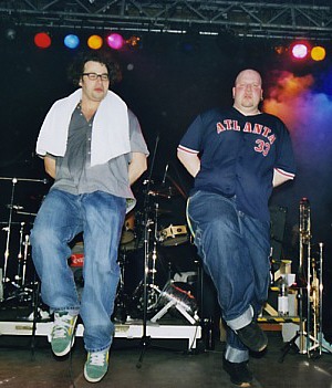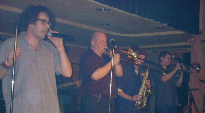 ![]() El Bosso & die Ping Pongs. Am 23.12.03 beim Reunion-Konzert im Cultura zu Münster. Von links nach rechts: Bosso (Gesang), Prof. Richie (Posaune), Chribo (Saxophon) und Koma Kid Uli (Trompete). |