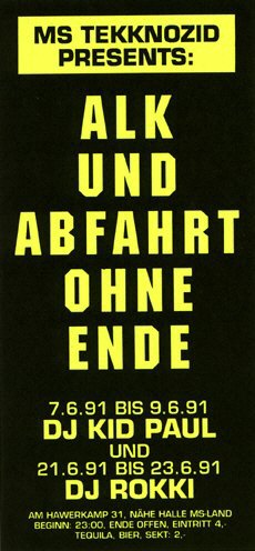 MS TEKKNOZID. 1990-1992. Unter dem Namen MS TEKKNOZID veranstalten Bernd Burhoff und Sascha Basler (beide Beat in Time) Techno-Parties am Hawerkamp.